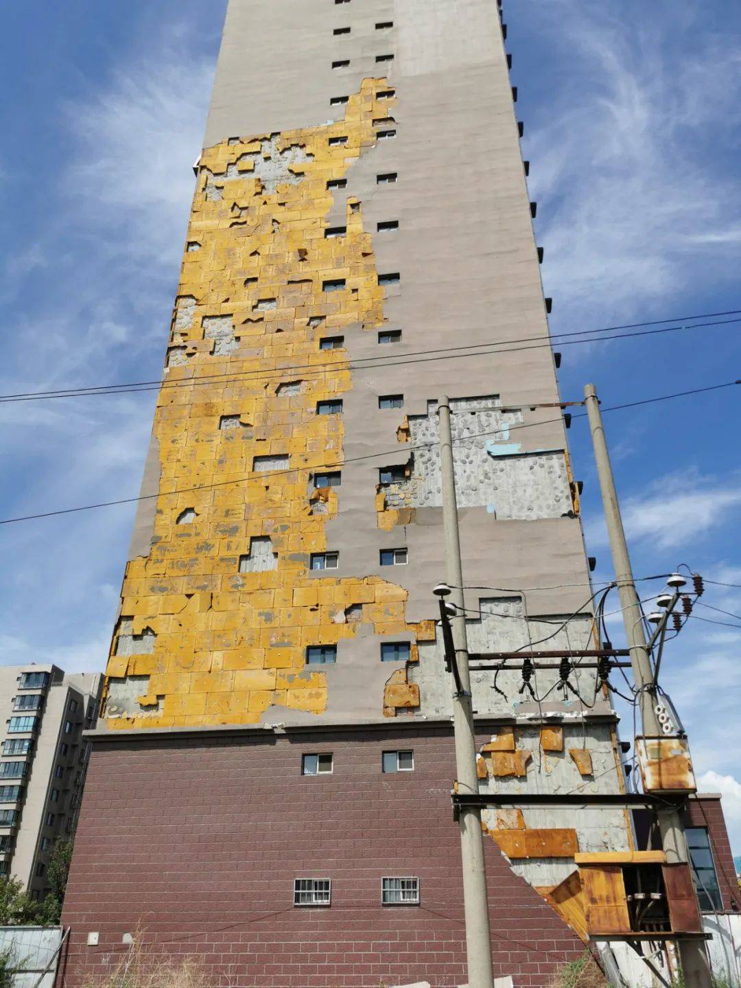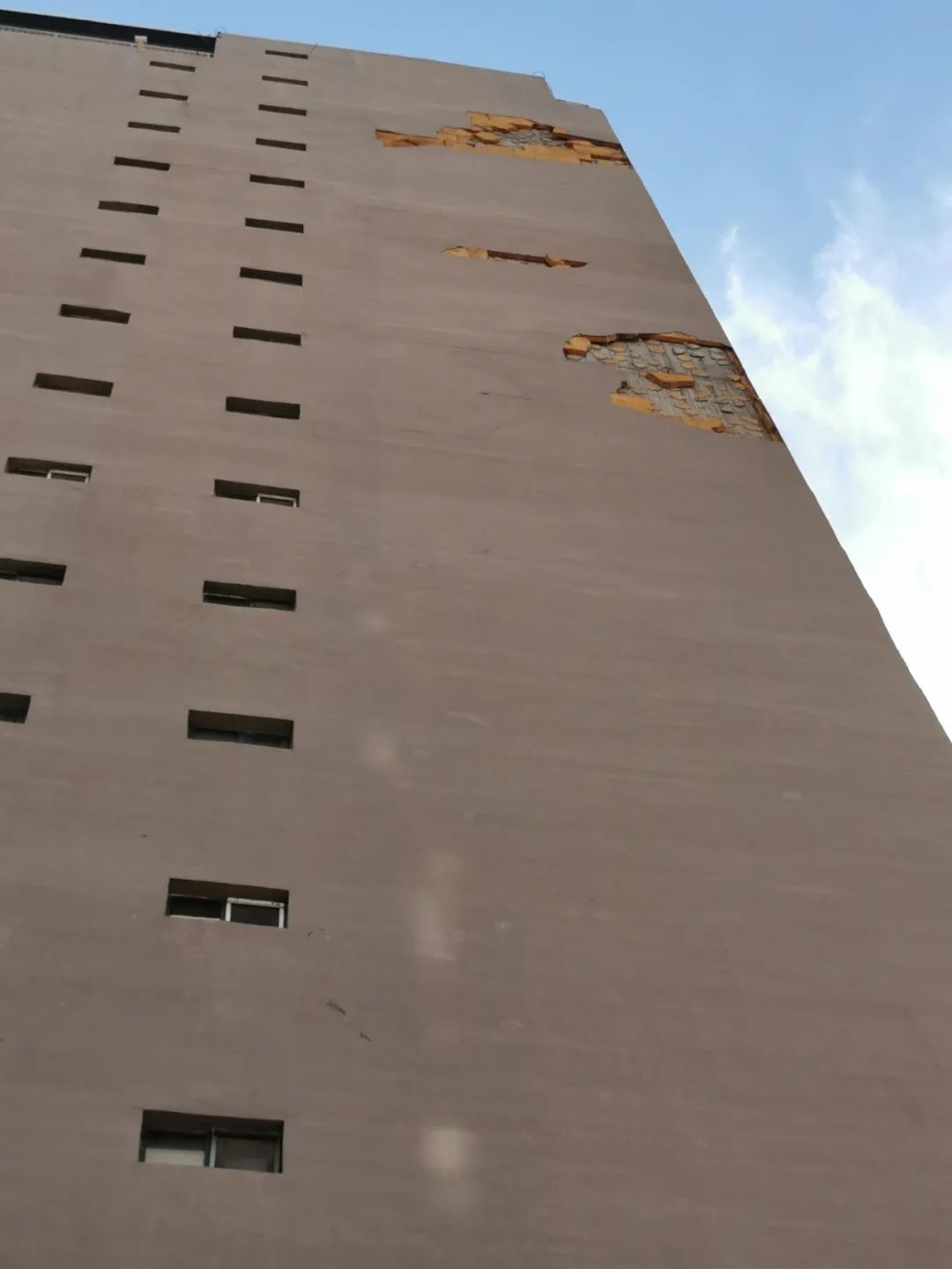 7月1日10時許,記者來到聞都雅苑4號樓下,抬頭望去,該棟樓西側墻壁有三處地方出現破損,大片的墻皮和里面的保溫層均已脫落。記者注意到,聞都雅苑共有4棟高層,該小區(qū)只有東西和南北兩條主干道以及西側一條小走廊,而4號樓正好位于南北主干道一側。據小區(qū)居民郝先生介紹,不斷掉落的保溫層已經威脅到了居民的人身安全。今年5月6日,呼和浩特市出現大風天氣,在風力的作用下,4號樓東西兩側的外墻保溫層出現大面積脫落,一位恰巧路過4號樓西側的女性業(yè)主不幸被掉落的材料砸中,導致腿部受傷,此事也給小區(qū)居民帶來了恐慌。