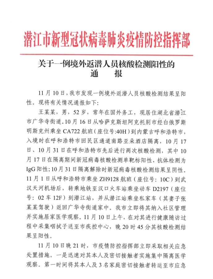 王某某,男,52歲,常年在國外務(wù)工,現(xiàn)居住湖北省潛江市廣華寺辦事處。2020年10月16日從哈薩克斯坦阿克托別市經(jīng)白俄羅斯明斯克州乘坐CA722航班(座位號(hào):40H)到內(nèi)蒙古呼和浩特市,入境時(shí)在呼和浩特市回民區(qū)通道南路亞朵酒店隔離,10月17日、10月31日在呼和浩特先后進(jìn)行兩次核酸檢測(cè),其中10月17日在隔離期間新冠病毒核酸檢測(cè)單靶標(biāo)陽性,抗體檢測(cè)為LgG陽性;10月31日隔離解除時(shí)新冠病毒核酸檢測(cè)陰性。11月1日從呼和浩特市乘坐ZH9128航班(座位號(hào):10C)到武漢天河機(jī)場(chǎng)后,轉(zhuǎn)乘地鐵至漢口火車站乘坐動(dòng)車D2197(座位號(hào):02車12F)到潛江,從潛江乘坐私家車(其妻子張某某駕駛)返回廣華家中,并落實(shí)社區(qū)管控措施。11月10日,其咽拭子送至潛江市疾控中心核酸檢測(cè)結(jié)果呈陽性。