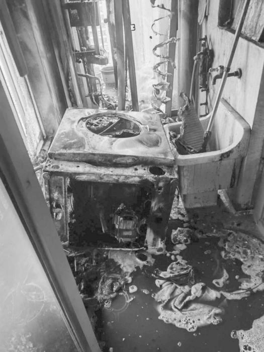 經(jīng)了解,起火點位于業(yè)主家的北陽臺,業(yè)主將吹風(fēng)機(jī)開機(jī)對著陽臺水管吹了整整一夜,該吹風(fēng)機(jī)發(fā)生故障著火后引燃了堆積的雜物,洗衣機(jī)被燒得只剩下骨架,玻璃窗戶受熱后完全破碎,雜物悉數(shù)被燒,水管、墻面也被熏黑。
