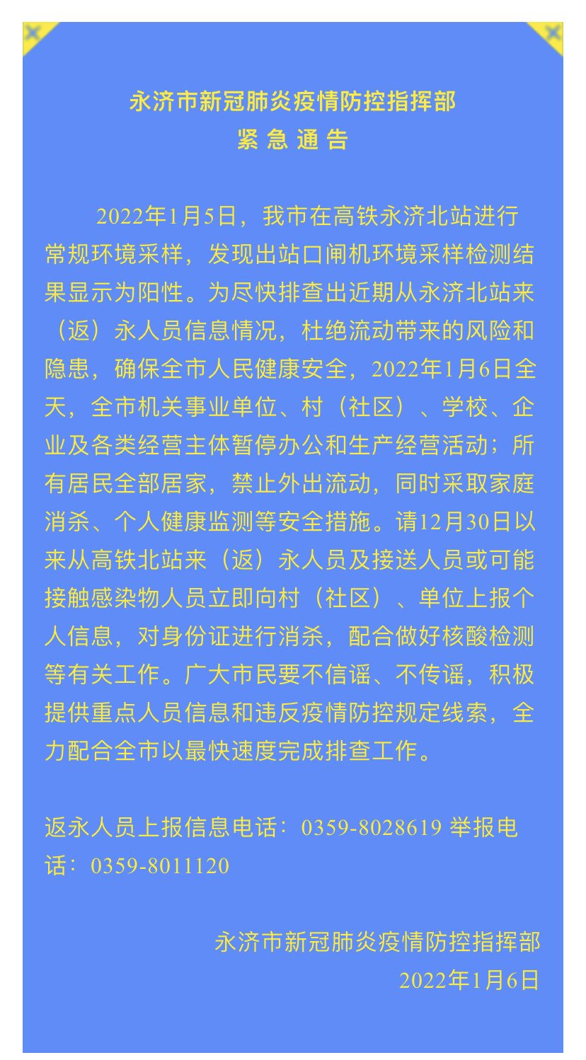 2022年1月5日,山西省永濟(jì)市在高鐵永濟(jì)北站進(jìn)行常規(guī)環(huán)境采樣,發(fā)現(xiàn)出站口閘機(jī)環(huán)境采樣檢測結(jié)果顯示為陽性。為盡快排查出近期從永濟(jì)北站來(返)永人員信息情況,杜絕流動帶來的風(fēng)險和隱患,確保全市人民健康安全,1月6日全天,全市機(jī)關(guān)事業(yè)單位、村(社區(qū))、學(xué)校、企業(yè)及各類經(jīng)營主體暫停辦公和生產(chǎn)經(jīng)營活動;所有居民全部居家,禁止外出流動,同時采取家庭消殺、個人健康監(jiān)測等安全措施。請12月30日以來從高鐵北站來(返)永人員及接送人員或可能接觸感染物人員立即向村(社區(qū))、單位上報個人信息,對身份證進(jìn)行消殺,配合做好核酸檢測等有關(guān)工作。廣大市民要不信謠、不傳謠,積極提供重點(diǎn)人員信息和違反疫情防控規(guī)定線索,全力配合全市以最快速度完成排查工作。