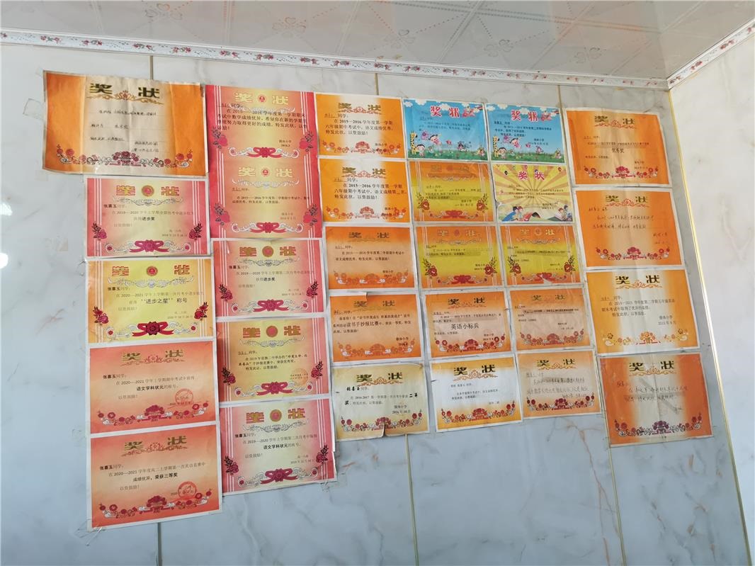 “這都是喜玉得的獎(jiǎng),還有很多沒有貼出來呢!”張喜玉爺爺笑著說。
