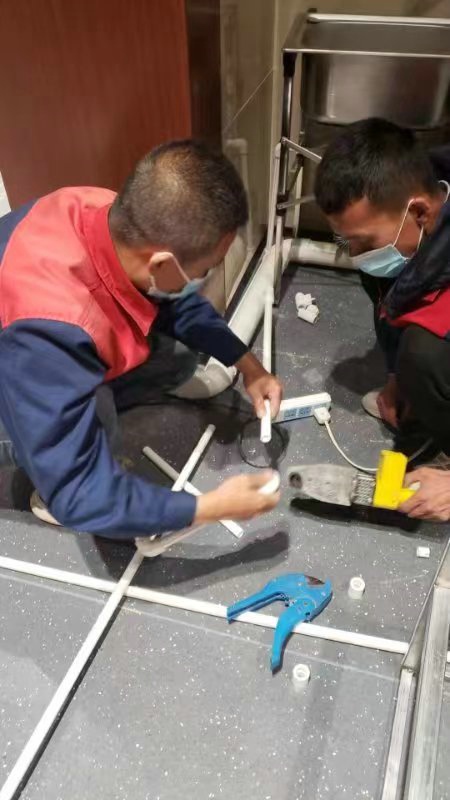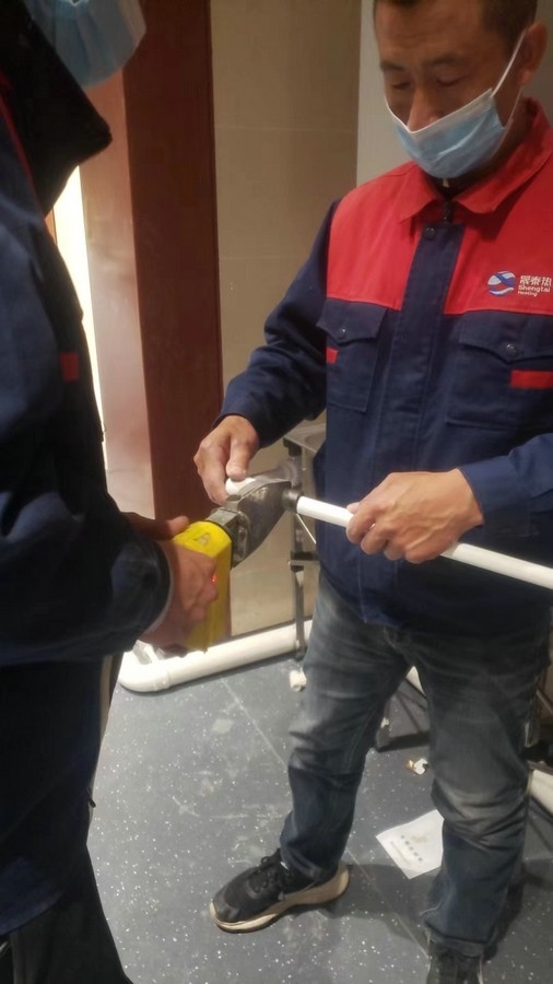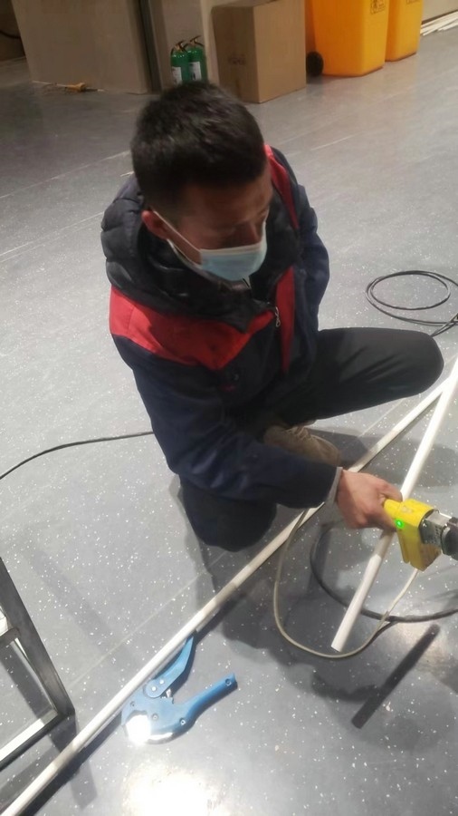 深夜,氣溫突降,冷風(fēng)毫不留情地灌入現(xiàn)場(chǎng)施工人員的衣服里,但無(wú)一人松勁、無(wú)一人退縮。由于材料分布范圍較大,只見身穿紅、藍(lán)工作服的他們徒步穿梭于各樓層之間,一刻不停地搬運(yùn)管件及材料、安裝設(shè)備。因疫情管控不能到現(xiàn)場(chǎng)的同事則堅(jiān)持利用通訊工具提供遠(yuǎn)程技術(shù)支持,為前線答疑解惑。方艙醫(yī)院建設(shè)屬于應(yīng)急工程,時(shí)間緊、任務(wù)重,加之現(xiàn)場(chǎng)材料缺乏,施工人員只能就地取材,爭(zhēng)分奪秒的同時(shí),“突擊隊(duì)”表現(xiàn)出了高度的專業(yè)性,迅速、細(xì)致、高效地進(jìn)行管道鋪設(shè)和熱水器安裝……凌晨4點(diǎn),在現(xiàn)場(chǎng)全體施工人員的共同努力下,方艙醫(yī)院水暖安裝工作順利完成。