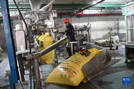 2月16日,在貴州省貴陽市開陽縣一家化肥生產(chǎn)企業(yè),工人駕駛叉車轉(zhuǎn)運準備外銷的化肥(無人機照片)。