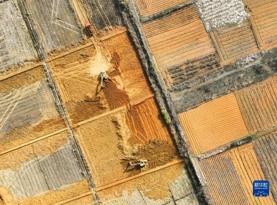 2月16日,在湖南省永州市道縣壽雁鎮(zhèn)芽洞村,工人駕駛挖掘機在高標準農(nóng)田建設項目現(xiàn)場施工(無人機照片)。