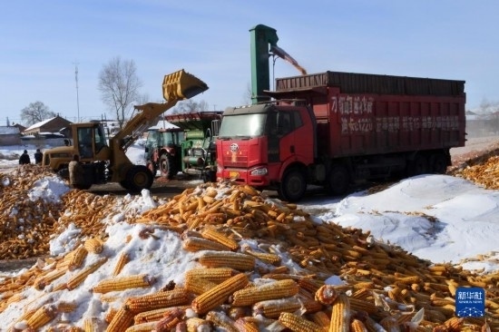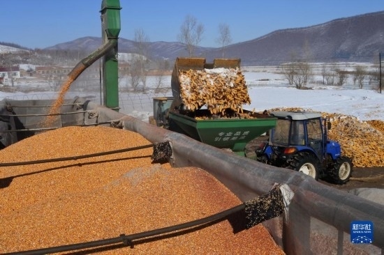 2月15日,在黑龍江省牡丹江市林口縣刁翎鎮(zhèn)三家子村,農(nóng)民利用設備將玉米脫粒,為春耕做準備。