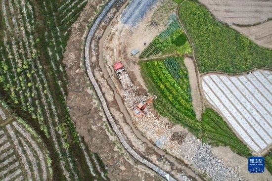 2月16日,工人在貴州省羅甸縣逢亭鎮(zhèn)腮里村治理河道,為春耕生產(chǎn)灌溉做準備(無人機照片)。