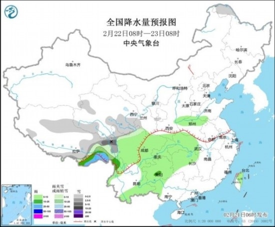 全國(guó)降水量預(yù)報(bào)圖(2月22日08時(shí)-23日08時(shí))。圖片來(lái)源:中央氣象臺(tái)網(wǎng)站