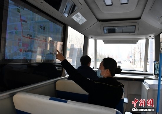 2月22日,智能網(wǎng)聯(lián)巴士901線測試車輛測試員正在介紹公交路線。雄安新區(qū)的智能網(wǎng)聯(lián)巴士近期正在進(jìn)行投入運營前的道路測試,該巴士配備了超高感度攝像頭、超聲波雷達(dá)、激光雷達(dá)、毫米波雷達(dá)等感知設(shè)備,組成了車輛的“眼睛”。車輛可自主識別紅綠燈、道路提示牌和車道標(biāo)線等,做出跟車、超車、停車等動作。中新社記者 韓冰 攝