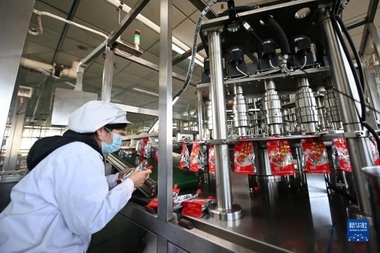 在天津市利民調(diào)料有限公司辣醬灌裝生產(chǎn)線,工作人員在檢查產(chǎn)品包裝(2月20日攝)。
