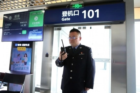 圖為亢杰在登機(jī)口匯報出境航班登機(jī)情況。