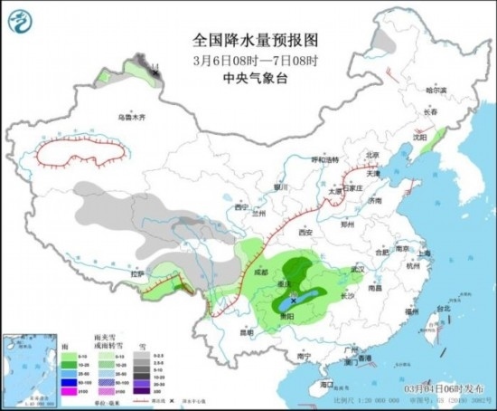 全國降水量預(yù)報圖(3月6日08時-7日08時)