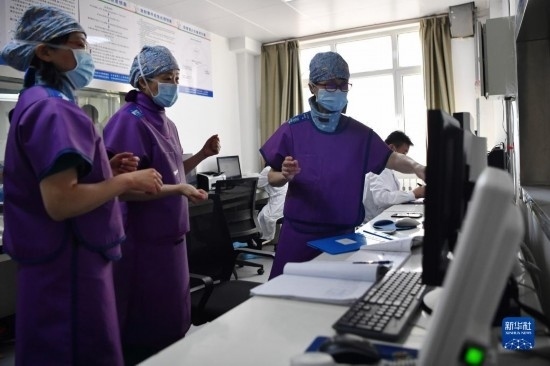 3月6日,馬娜(右)和同事穿上鉛衣準(zhǔn)備手術(shù)。