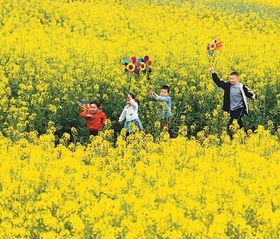 2022年,四川省眉山市仁壽縣謝安鎮(zhèn)扎林村對1200畝撂荒地集中整治,通過集體經(jīng)濟(jì)聯(lián)合社進(jìn)行統(tǒng)一種植、統(tǒng)一管理,既盤活了閑置土地、讓村民變股民,又讓荒山成景點(diǎn)。圖為3月5日,兒童在扎林村油菜花地里玩耍。 潘 帥攝(人民視覺)