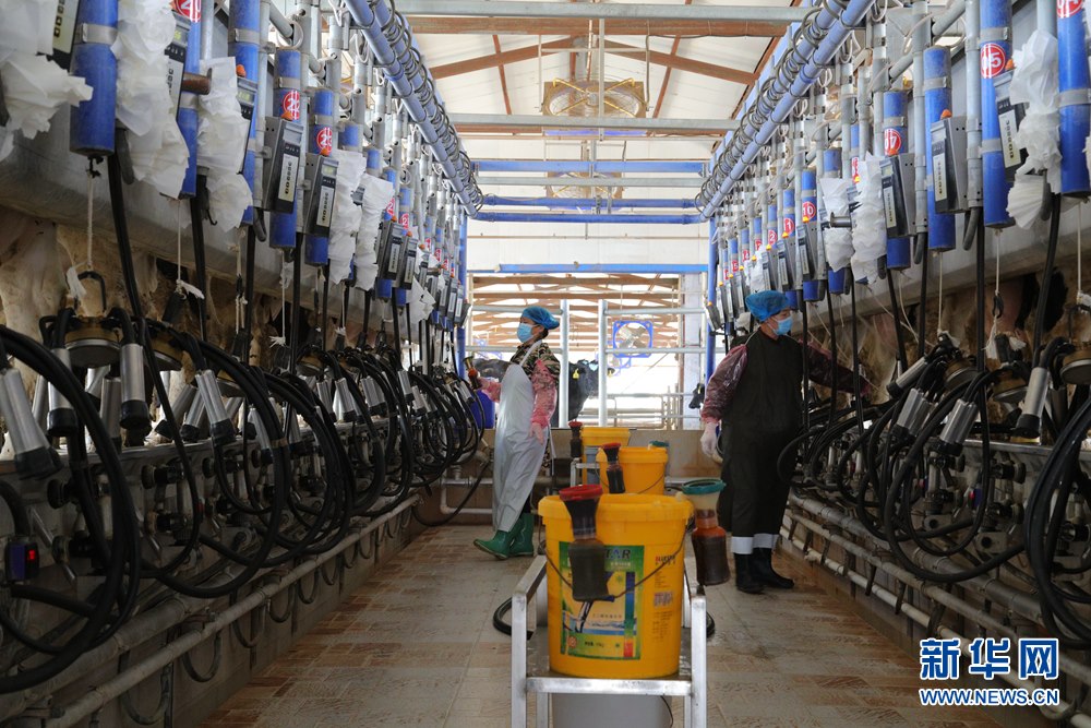 小黑山奶牛養(yǎng)殖專業(yè)合作社的工人在擠奶臺上擠奶。新華網(wǎng)發(fā)(白敖敏 攝)