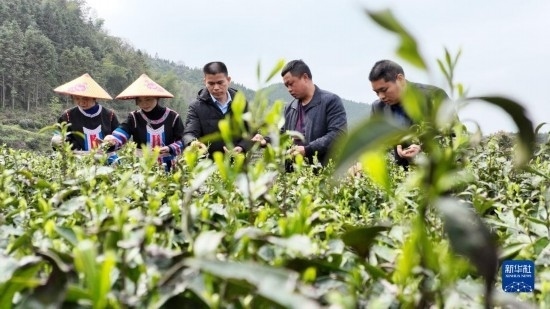 3月20日,在湖南衡陽常寧市塔山瑤族鄉(xiāng),技術(shù)人員在茶園指導(dǎo)茶農(nóng)采茶(無人機(jī)照片)。