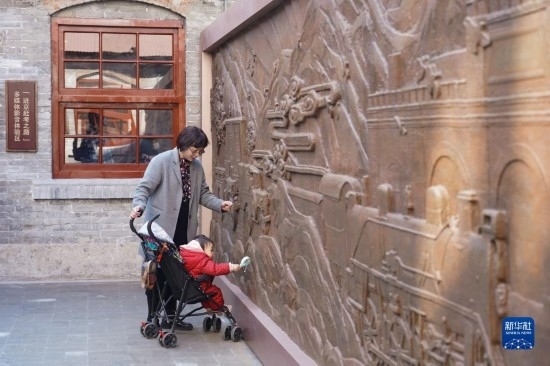 3月25日,一位游客帶著孩子參觀清華園車站舊址內的一處浮雕。
