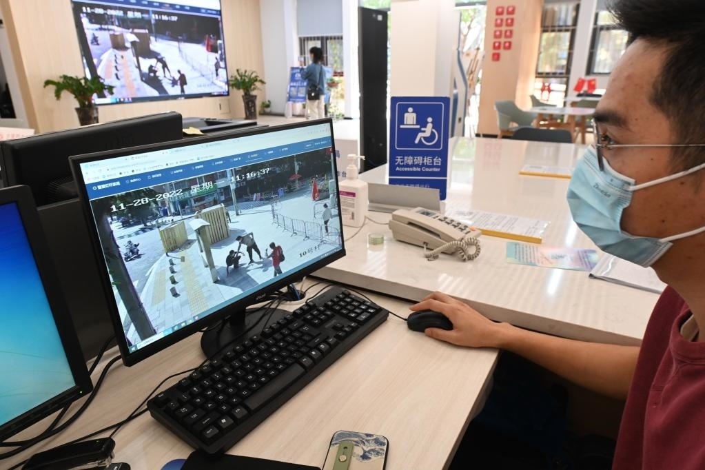 2022年11月28日,福州市福瑞社區(qū)便民服務(wù)中心社區(qū)智慧平臺(tái)可即時(shí)收到小區(qū)周邊智慧燈桿監(jiān)控拍攝到的路面情況,以及路人需要幫助的信息等。新華社記者林善傳攝