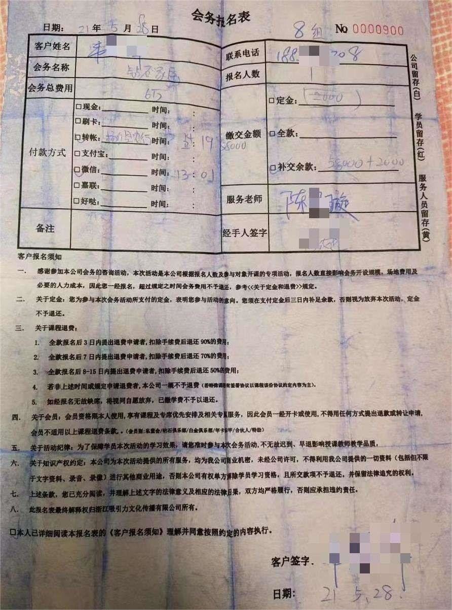 “我愿意?!边@名女學(xué)員回答后,便接過楊濤鳴給的一張“會務(wù)報(bào)名表”的單據(jù)。