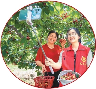 2022年6月8日,江蘇省海安市大公鎮(zhèn)姜橋村一櫻桃種植園內(nèi),青年黨員志愿者與農(nóng)場主一起直播推銷剛剛采摘的櫻桃。 翟慧勇攝(人民視覺)