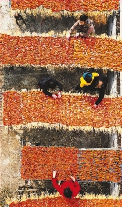 2022年12月16日,湖南省永州市新田縣枧頭鎮(zhèn)大觀堡村,村民在晾曬紅薯干。近年來,該縣利用訂單服務(wù)和農(nóng)村電商平臺,實(shí)現(xiàn)農(nóng)產(chǎn)品線上線下銷售。 劉貴雄攝(人民視覺)