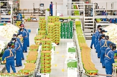 2022年11月27日,江西省贛州市信豐縣高新技術(shù)產(chǎn)業(yè)園區(qū)的一家臍橙加工企業(yè),工人在智能分選包裝生產(chǎn)線上篩選裝運(yùn)臍橙鮮果。 朱海鵬攝(人民視覺)
