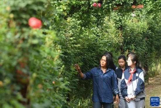 4月20日,玫瑰莊園的創(chuàng)始人季梅(左一)向前來研學的中學生介紹玫瑰品種。