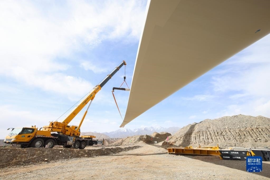 4月21日在新疆克孜勒蘇柯爾克孜自治州烏恰縣拍攝的等待吊裝的風(fēng)機(jī)葉片。