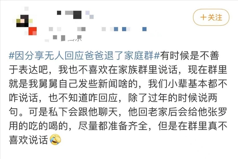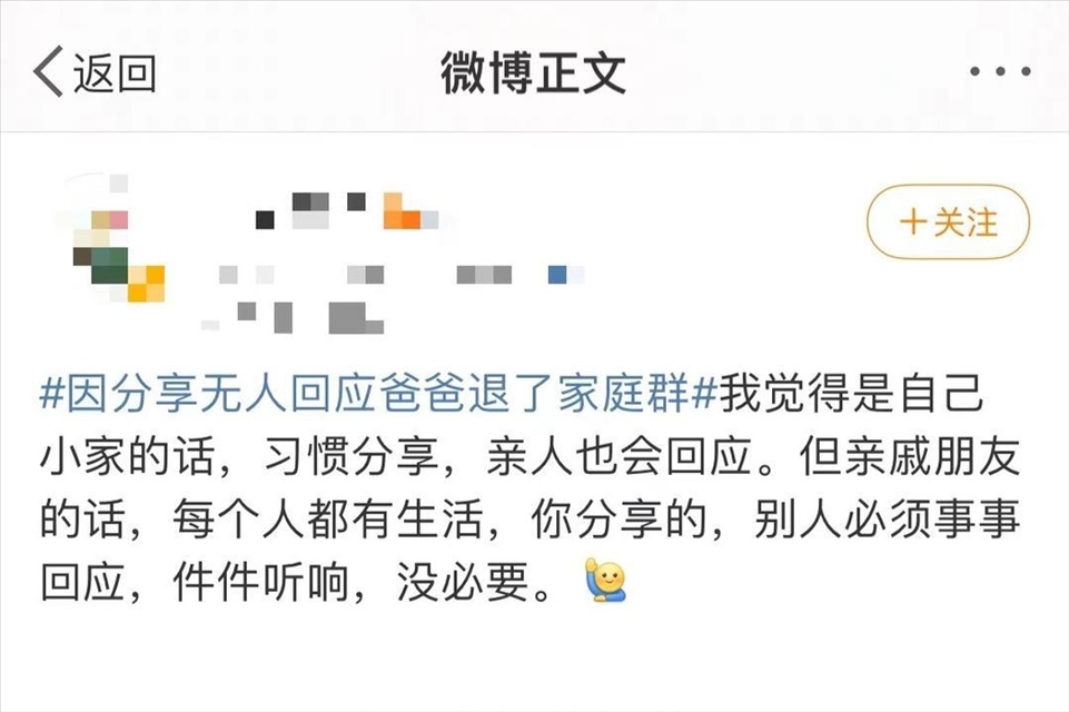 日前,一則“因分享無人回應(yīng)爸爸退了家庭群”的話題引發(fā)公眾關(guān)注,登上熱搜。