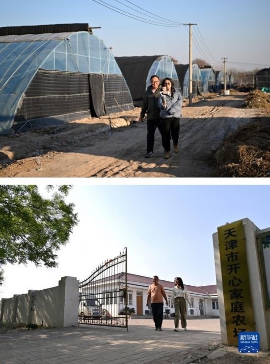 拼版照片:上圖為呂欣和丈夫馮愛喜通過直播介紹自家種植藍(lán)莓的大棚(2022年12月6日攝);下圖為呂欣和丈夫馮愛喜一起走出家庭農(nóng)場(5月3日攝)。
