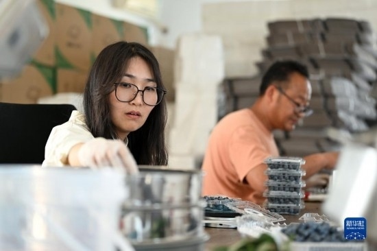 呂欣和丈夫馮愛喜一起包裝剛采摘的藍(lán)莓(5月3日攝)。