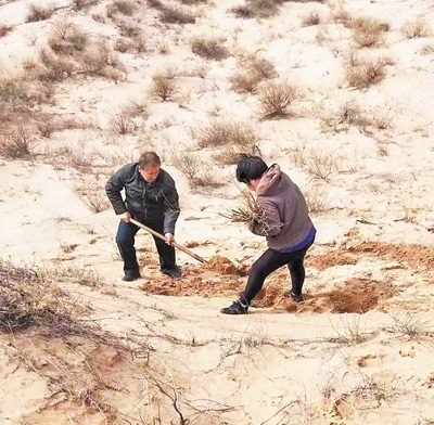 2007年,賈道爾吉和妻子在沙漠里植樹(shù)。伊金霍洛旗林草局供圖