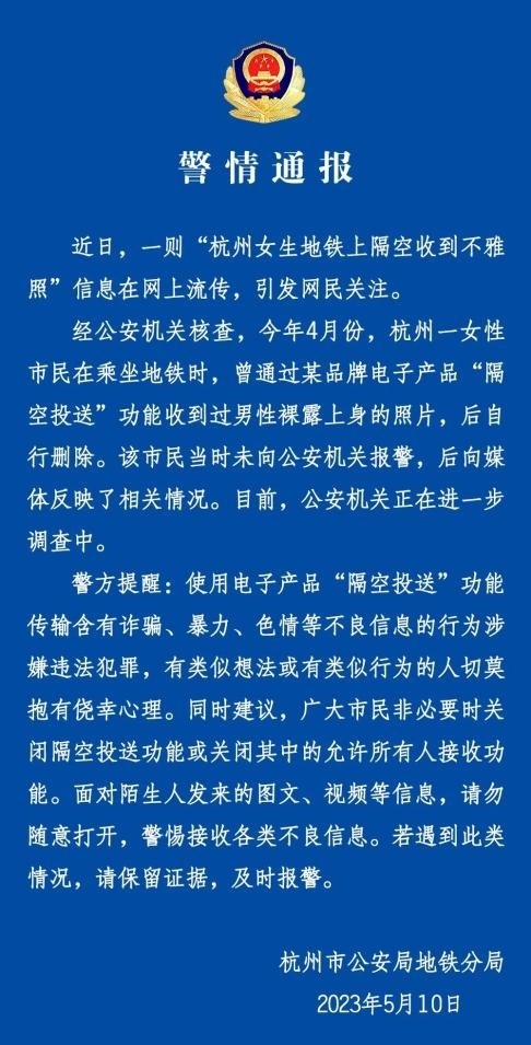 ·杭州一女子地鐵上隔空收到不雅照,警方回應:正在進一步調查。