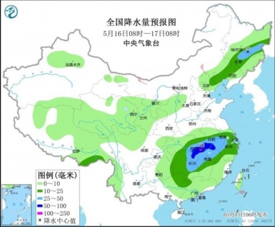 5月16日08時至17日08時,東北地區(qū)中南部、江淮南部、江漢東部、江南大部、廣西東北部等地部分地區(qū)有中到大雨,其中,安徽西南部、湖北東部、湖南北部、江西北部等地部分地區(qū)有暴雨或大暴雨(100~110毫米)。內(nèi)蒙古中東部等地部分地區(qū)有4~6級風(fēng)。