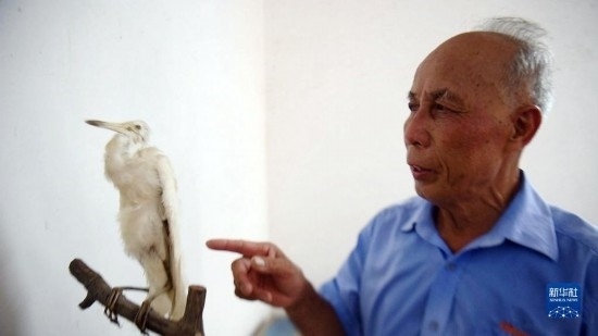 莫積瑞老人介紹白鷺標(biāo)本的制作過程(5月20日攝)。