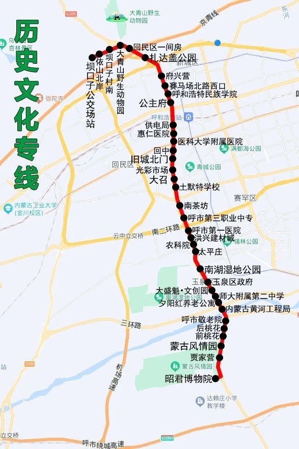 沿途設(shè)站:壩口子公交場(chǎng)站、依山北岸、壩口子村南、大青山野生動(dòng)物園、回民區(qū)一間房、扎達(dá)蓋公園、府興營(yíng)、賽馬場(chǎng)北路西口、呼和浩特民族學(xué)院、公主府、供電局、匯仁醫(yī)院、醫(yī)科大學(xué)附屬醫(yī)院、回中、舊城北門、光彩市場(chǎng)、大召、土默特學(xué)校、南茶坊、呼市第三職業(yè)中學(xué)、呼市第一醫(yī)院、洪興建材城、農(nóng)科院、太平莊、南湖濕地公園、玉泉區(qū)政府、大盛魁文創(chuàng)園、師大附屬第二中學(xué)、夕陽紅養(yǎng)老公寓、內(nèi)蒙古黃河工程局、呼市敬老院、后桃花、前桃花、蒙古風(fēng)情園、賈家營(yíng)、昭君博物院。