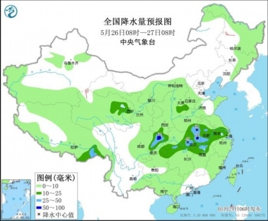 全國(guó)降水量預(yù)報(bào)圖(5月25日08時(shí)-26日08時(shí))