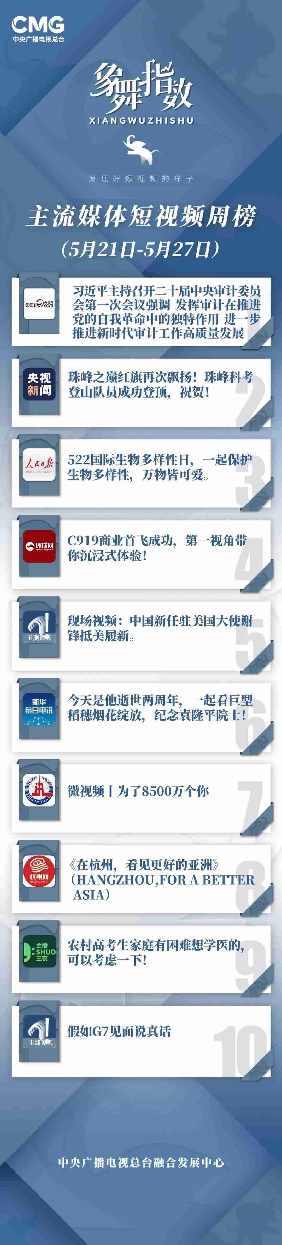 中央廣播電視總臺“象舞指數”評議品牌,推出主流媒體短視頻周榜、總臺短視頻周榜。在2023年5月21日—5月27日,這些內容引發(fā)大眾關注: