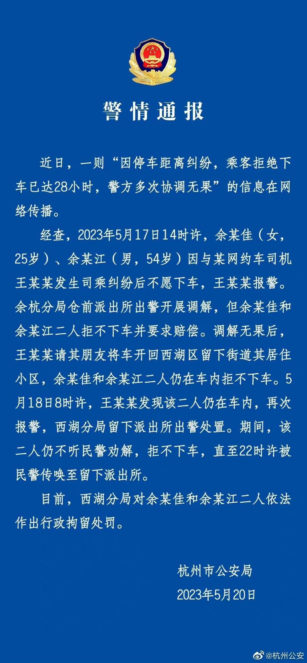 近日,杭州一名網(wǎng)約車(chē)司機(jī)稱(chēng),因兩名乘客打車(chē)點(diǎn)不能停車(chē),商議在距離上車(chē)地點(diǎn)20米處等乘客。乘客上車(chē)后對(duì)司機(jī)大吼大叫,司機(jī)決定取消訂單。但上述乘客卻“賴(lài)”在網(wǎng)約車(chē)上拒絕下車(chē),時(shí)間超過(guò)24小時(shí)。沖突期間警方曾前來(lái)調(diào)解,但勸說(shuō)未果。5月20日,杭州公安通報(bào),兩名乘客被行政拘留7日。