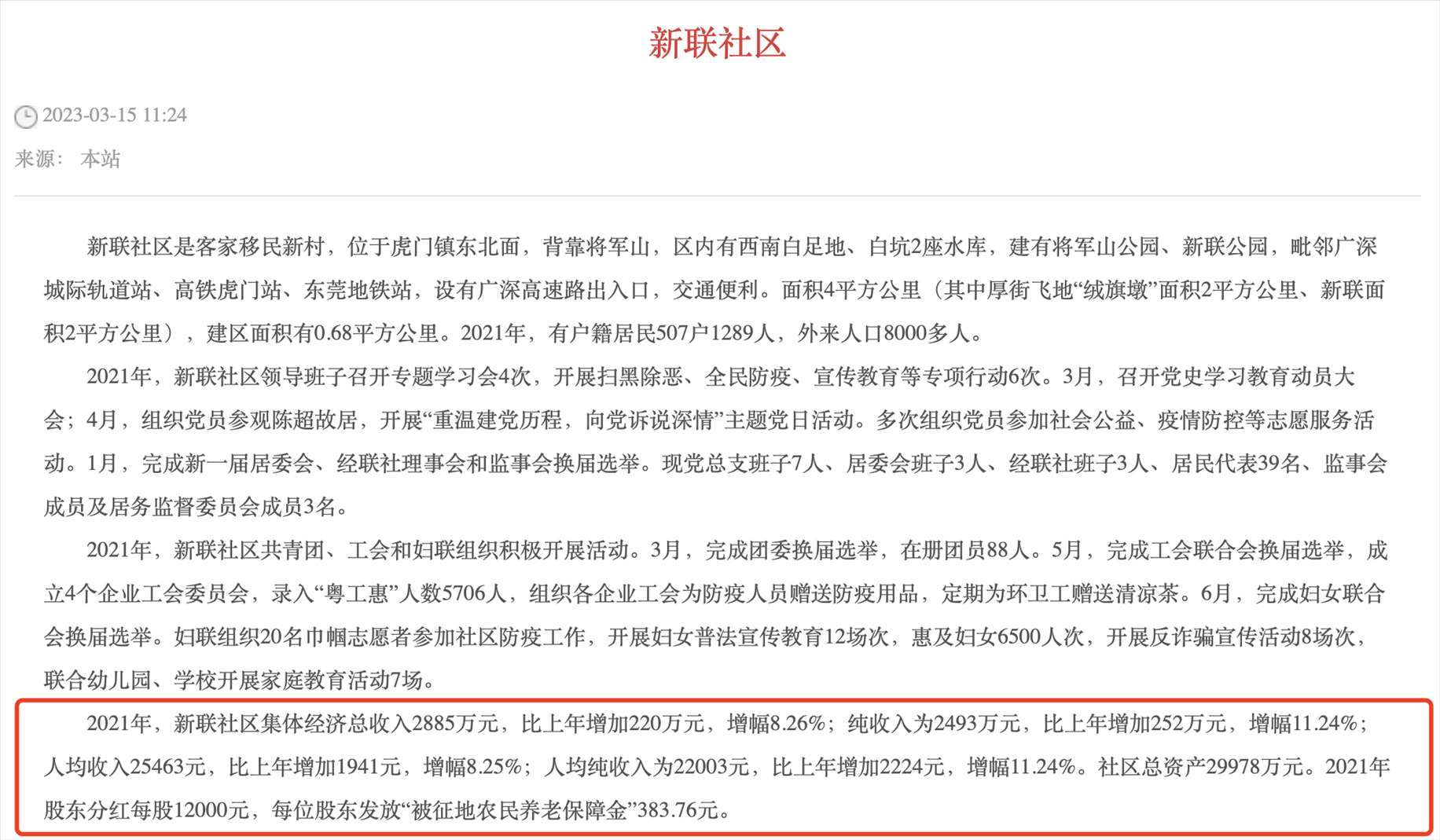 其中,新聯(lián)社區(qū)的人均收入為25463元,比上年增加1941元,增幅8.25%;人均純收入為22003元,比上年增加2224元,增幅11.24%。社區(qū)總資產(chǎn)29978萬元。2021年股東分紅每股12000元,每位股東發(fā)放“被征地農(nóng)民養(yǎng)老保障金”383.76元。