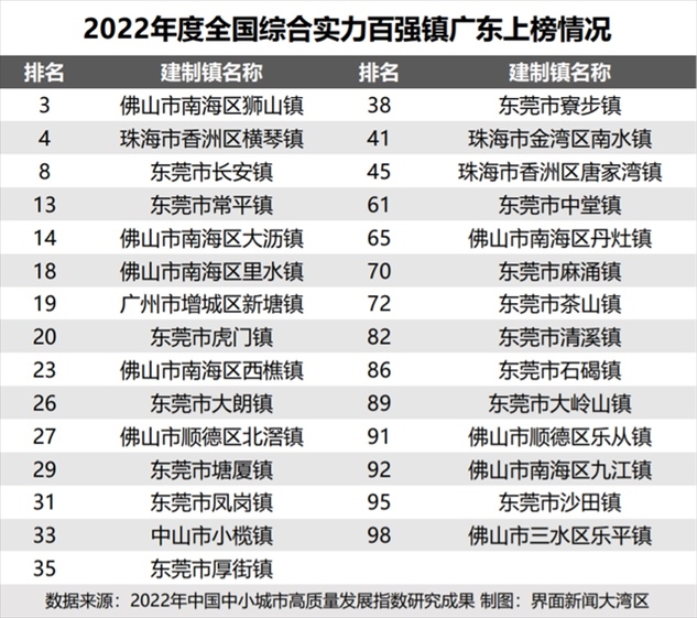 中國中小城市發(fā)展指數(shù)研究課題組、國信中小城市指數(shù)研究院去年發(fā)布的《2022年中國中小城市高質量發(fā)展指數(shù)研究成果》顯示,在全國百強鎮(zhèn)名單中,廣東共有29個鎮(zhèn)上榜。其中,東莞虎門鎮(zhèn)位列全國第20名。