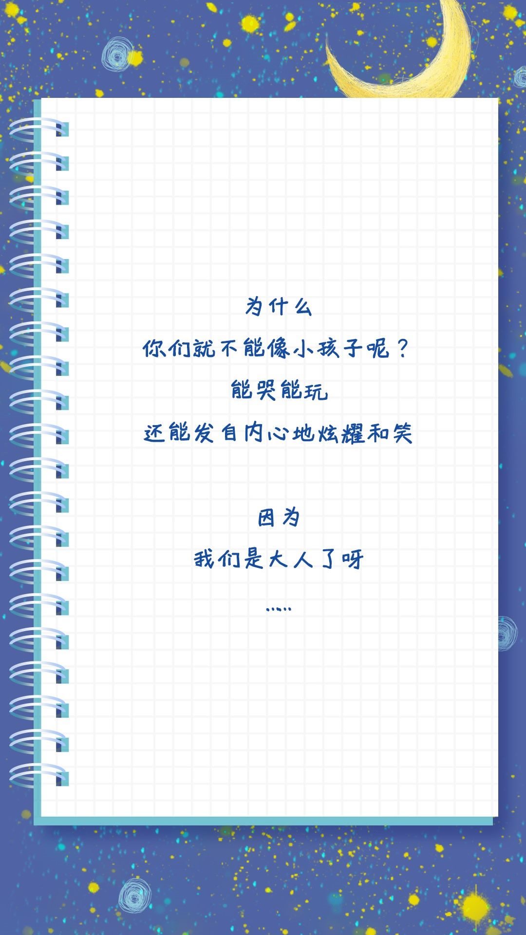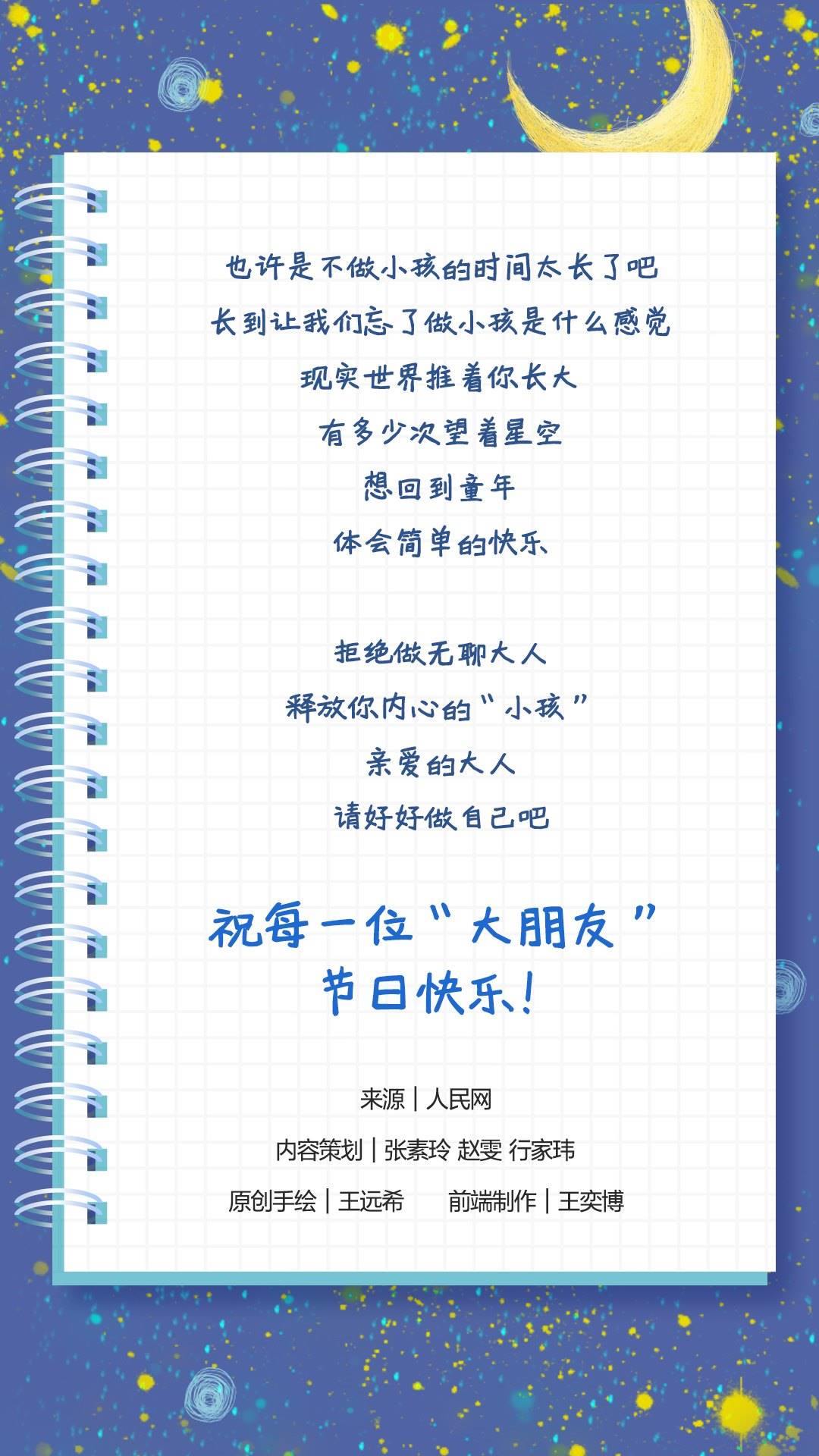 也許是不做小孩的時(shí)間太長(zhǎng)了吧,長(zhǎng)到讓我們忘了做小孩是什么感覺(jué)。現(xiàn)實(shí)世界推著你長(zhǎng)大,有多少次仰望星空,想回到童年,體會(huì)簡(jiǎn)單的快樂(lè)。拒絕做無(wú)聊大人,釋放內(nèi)心的“小孩”,親愛(ài)的大人,請(qǐng)好好做自己吧!祝每一位“大朋友”節(jié)日快樂(lè)!