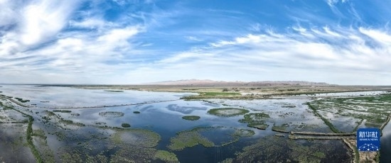 這是6月4日拍攝的位于內(nèi)蒙古巴彥淖爾市烏拉特前旗的烏梁素海(無(wú)人機(jī)全景照片)。