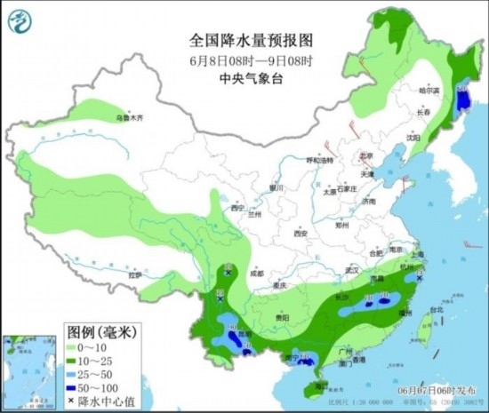 7-9日,江南、華南、云貴高原、四川南部等地有中到大雨,局地有暴雨,小時雨量20-50毫米,局地可達60毫米以上;華北、黃淮、東北地區(qū)等地有陣雨或雷陣雨,局地伴有雷暴大風(fēng)或冰雹等強對流天氣,中央氣象臺6月7日06時發(fā)布強對流天氣藍色預(yù)警。