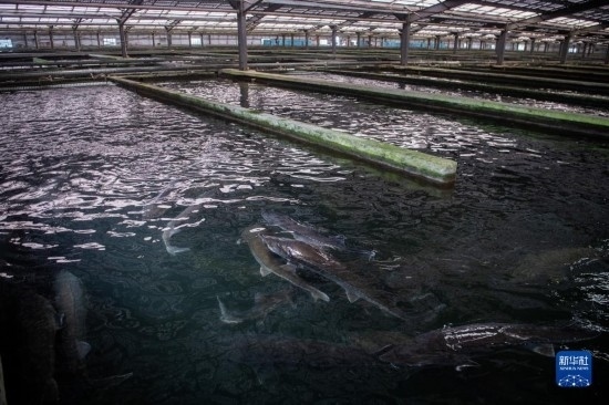 6月7日在中國清江(宜都)鱘魚谷養(yǎng)殖車間拍攝的鱘魚。