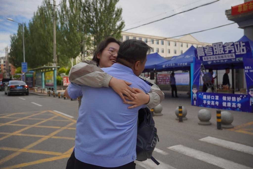 6月9日,在遼寧省阜新市海州高級中學(xué)考點,考生邢雨桐與身為考點執(zhí)勤民警的父親熱情相擁。新華社記者王瑩 攝
