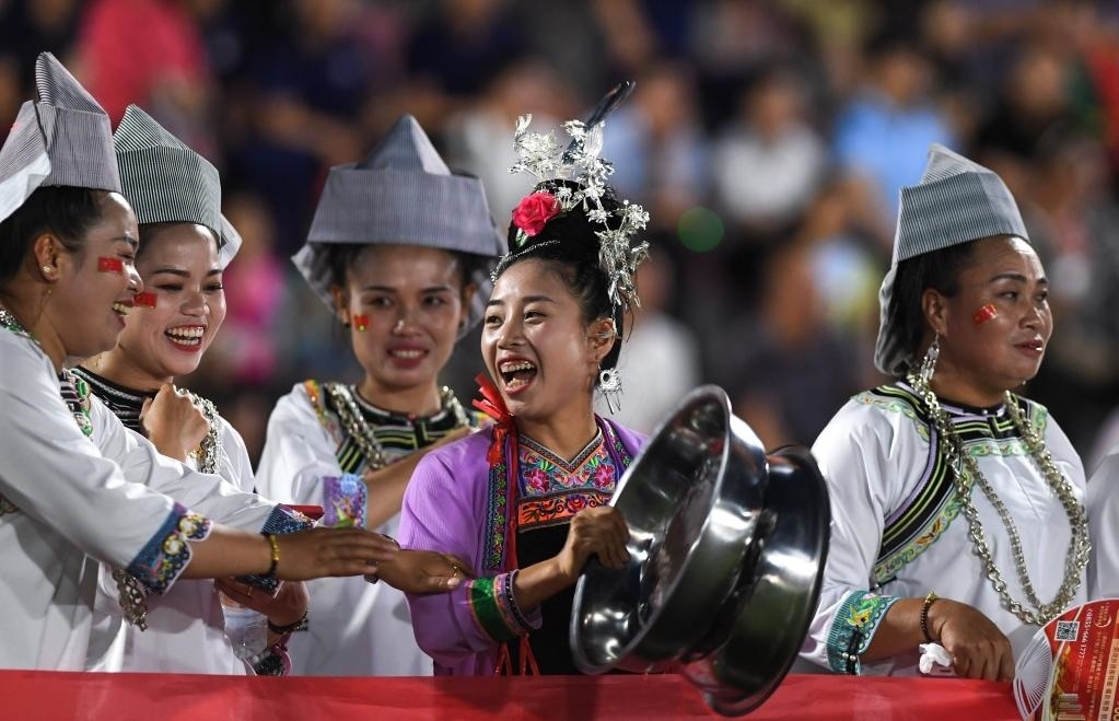 6月9日,少數(shù)民族村民為球隊助威。新華社記者 楊文斌 攝