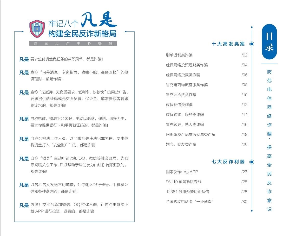 人民網(wǎng)北京6月16日電 (記者郝萍、梁秋坪)按照中央宣傳部、公安部聯(lián)合部署開展的“全民反詐在行動”集中宣傳月活動有關(guān)要求,國家反詐中心編寫制作并最新推出《2023版防范電信網(wǎng)絡(luò)詐騙宣傳手冊》(以下簡稱《手冊》),詳細(xì)梳理10類高發(fā)電信網(wǎng)絡(luò)詐騙案件特點和詐騙手法,深入介紹7大反詐利器的主要功能和使用方法,進(jìn)一步擴(kuò)大反詐宣傳覆蓋面,提升廣大群眾識騙防騙意識和能力。