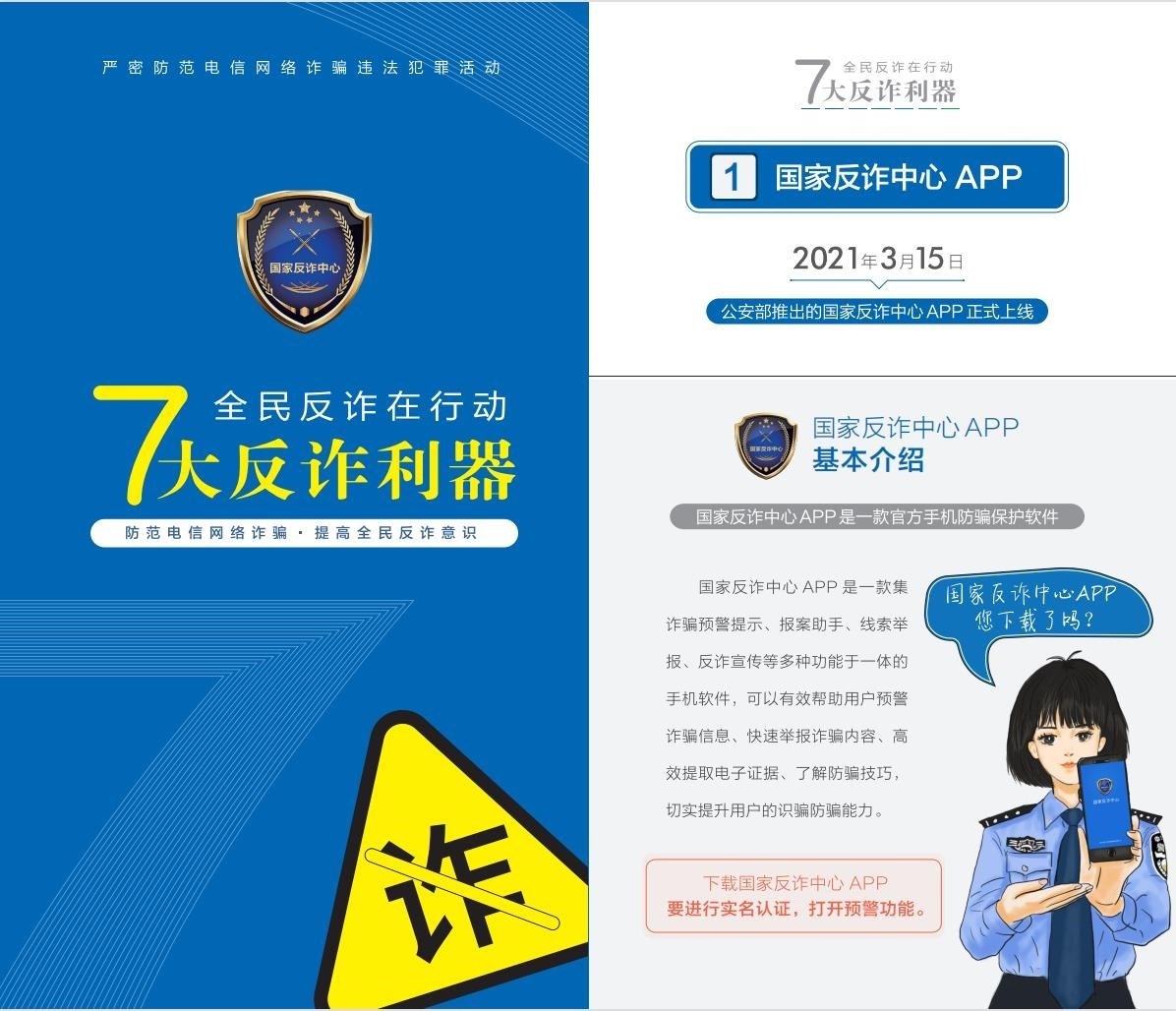 聚焦“關(guān)口前移、預(yù)防為先”,《手冊》詳細(xì)介紹了過去兩年里,公安部會同工信部、中國人民銀行聯(lián)合推出的七大反詐利器——國家反詐中心APP、96110預(yù)警勸阻專線、12381涉詐預(yù)警勸阻短信系統(tǒng)、全國移動電話卡“一證通查”、云閃付APP“一鍵查卡”、反詐名片、全國互聯(lián)網(wǎng)賬號“一證通查2.0”的主要功能和下載查詢方法,鼓勵廣大群眾多下載多使用,共同構(gòu)筑攔截電信網(wǎng)絡(luò)詐騙的“防火墻”。