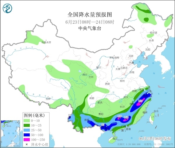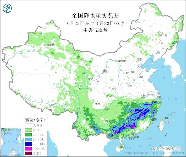 22日,南方地區(qū)普遍被雨水籠罩,浙江、福建、江西、湖南、廣西、廣東及云南東部的部分地區(qū)出現(xiàn)大到暴雨,廣西貴港、廣東清遠(yuǎn)局地降雨量甚至達(dá)到200毫米至244毫米。