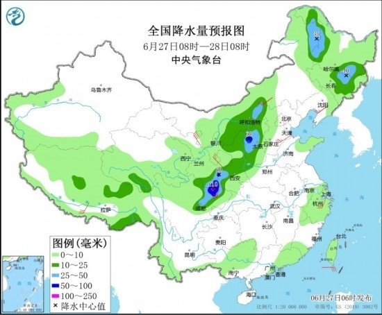 6月27日08時至28日08時,甘肅東南部、陜西、四川盆地、內(nèi)蒙古中部和東北部、山西西部、黑龍江西部和東南部、吉林東北部、廣東東南部等地部分地區(qū)有中到大雨,其中,山西西部、陜西西南部、四川盆地北部等地部分地區(qū)有暴雨或大暴雨(100~110毫米)。西北地區(qū)東部、華北、江南東部、西藏南部等地部分地區(qū)有4~6級風,其中,內(nèi)蒙古西北部部分地區(qū)有6~7級風(見圖2)。